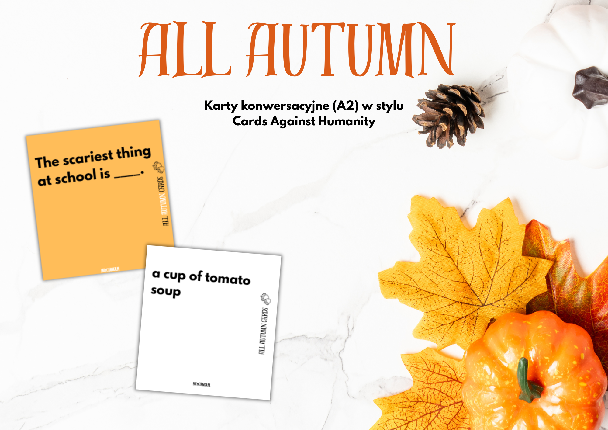 All Autumn – Karty konwersacyjne A2 to lekki, zabawny i super-praktyczny zestaw do mówienia po angielsku w klimacie jesieni: Halloween, dynie/pumpkins, przytulne „cozy vibes” oraz Święto Dziękczynienia. Mechanika inspirowana Cards Against Humanity: uczeń dobiera białą kartę-odpowiedź do czarnej karty-pytania z luką – powstaje śmieszne, często nieoczekiwane zdanie, które aż prosi się o dopowiedzenie, pytania follow-up i mini-dialogi.