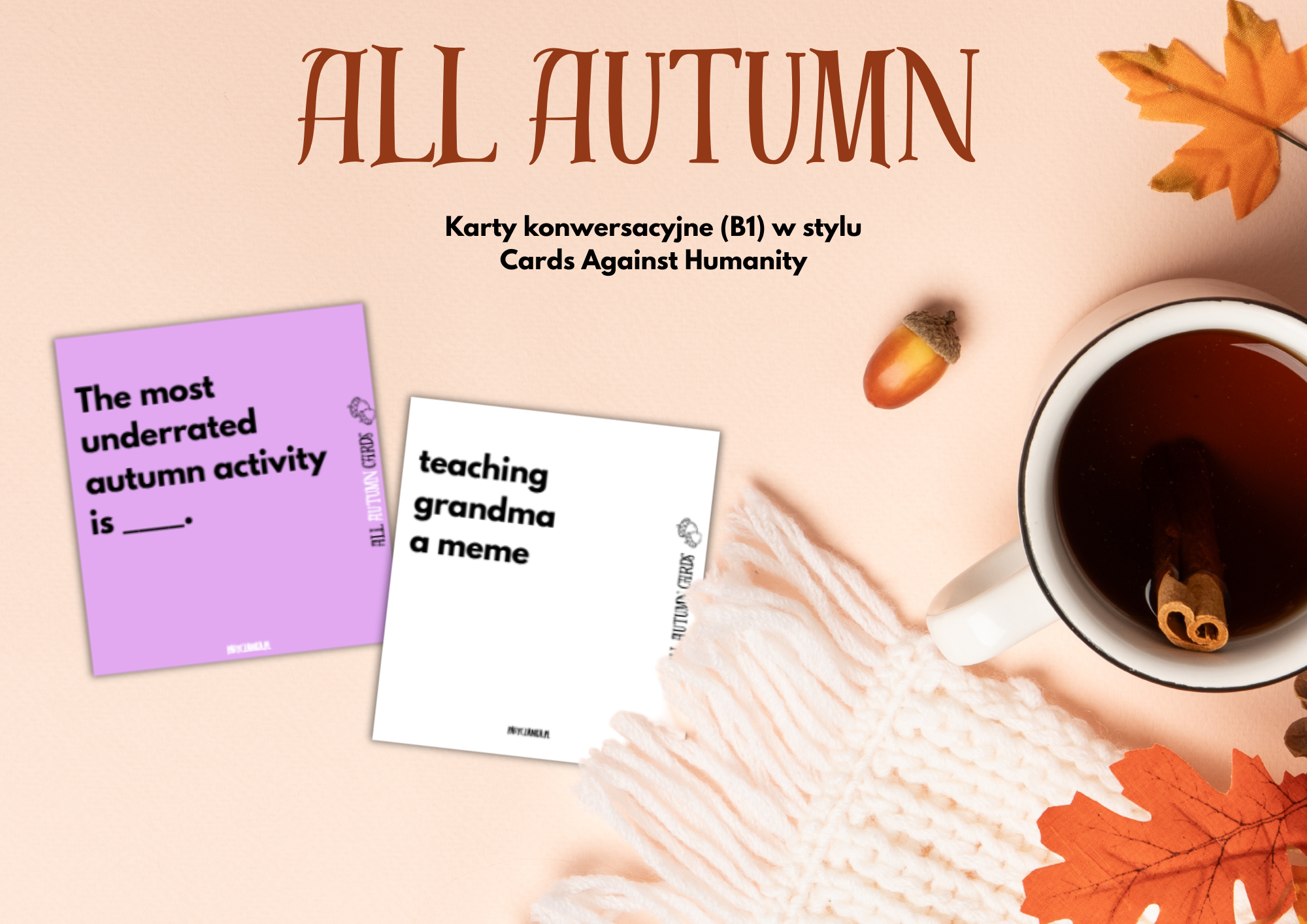 All Autumn – Karty konwersacyjne B1 to lekki, zabawny i super-praktyczny zestaw do mówienia po angielsku w klimacie jesieni: Halloween, dynie/pumpkins, przytulne „cozy vibes” oraz Święto Dziękczynienia. Mechanika inspirowana Cards Against Humanity: uczeń dobiera białą kartę-odpowiedź do czarnej karty-pytania z luką – powstaje śmieszne, często nieoczekiwane zdanie, które aż prosi się o dopowiedzenie, pytania follow-up i mini-dialogi.