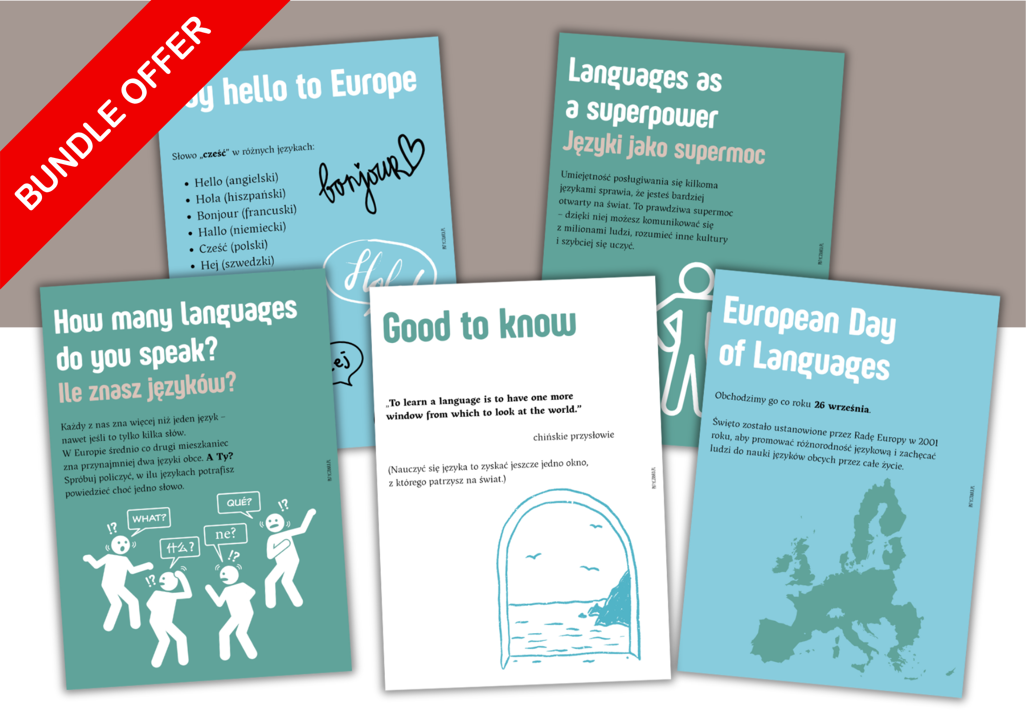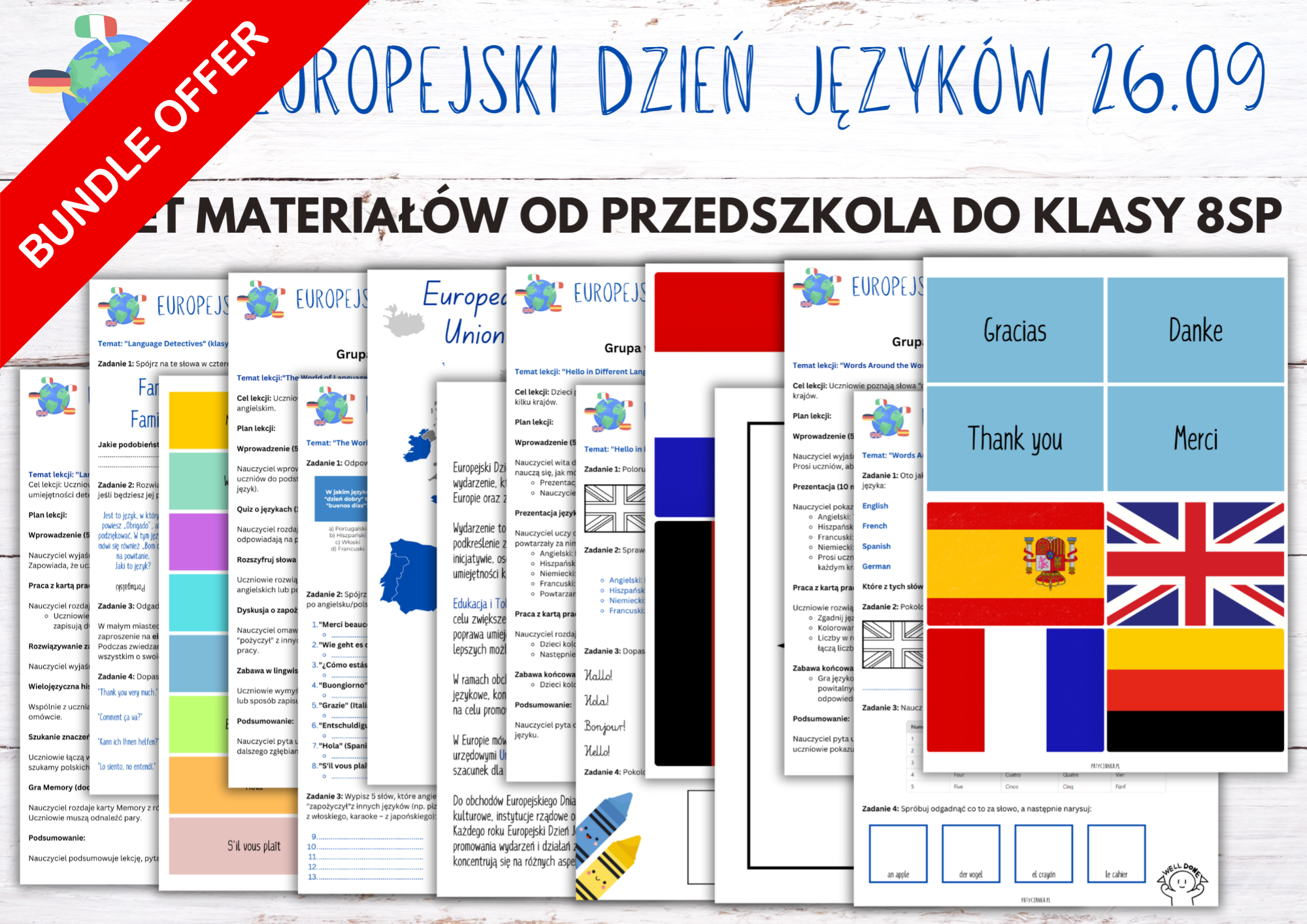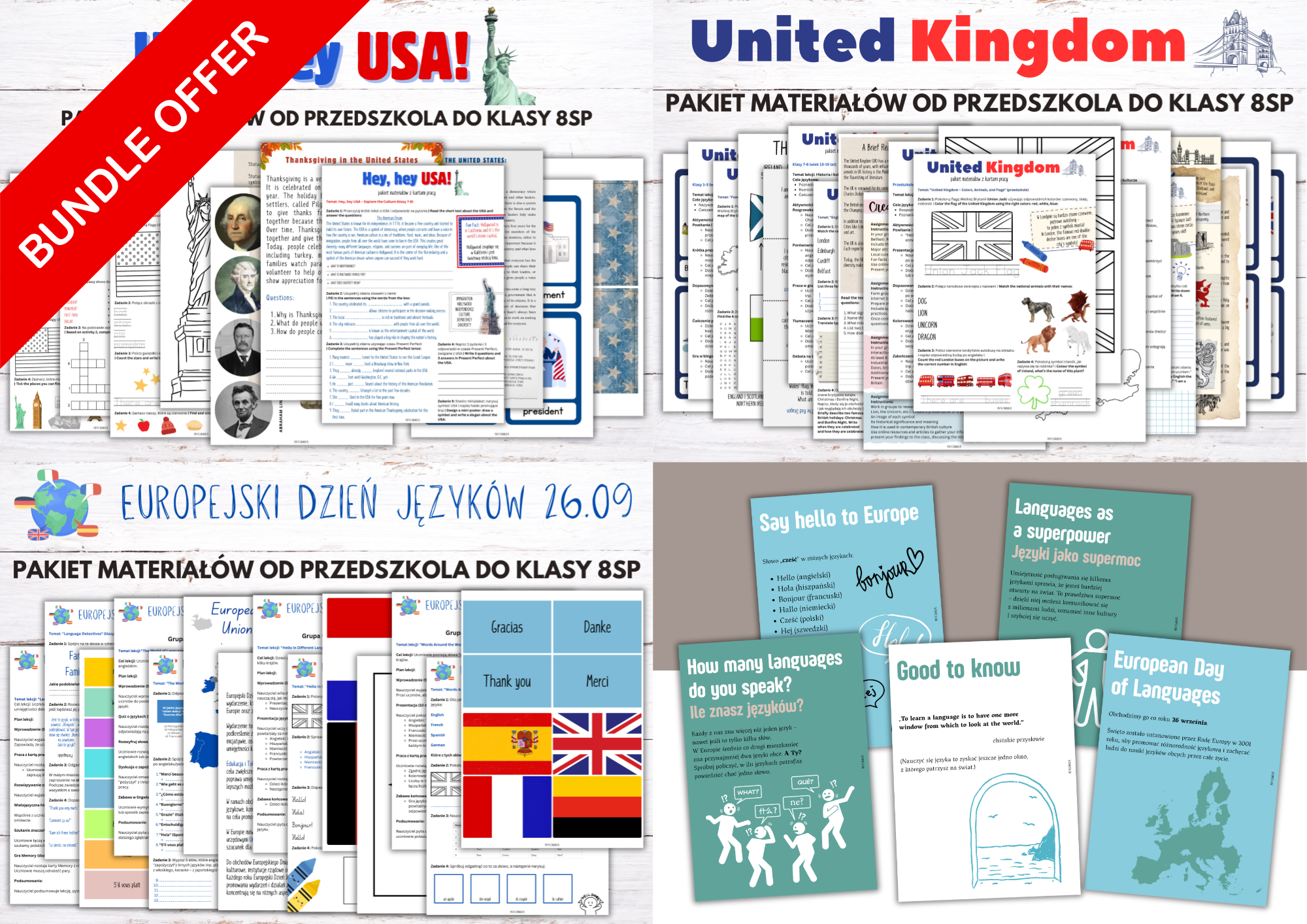 Szukasz materiałów, które zachwycą uczniów i odciążą Cię z przygotowań? Ten czteroelementowy pakiet to gotowe rozwiązanie – łączy język i kulturę w angażującej formie.