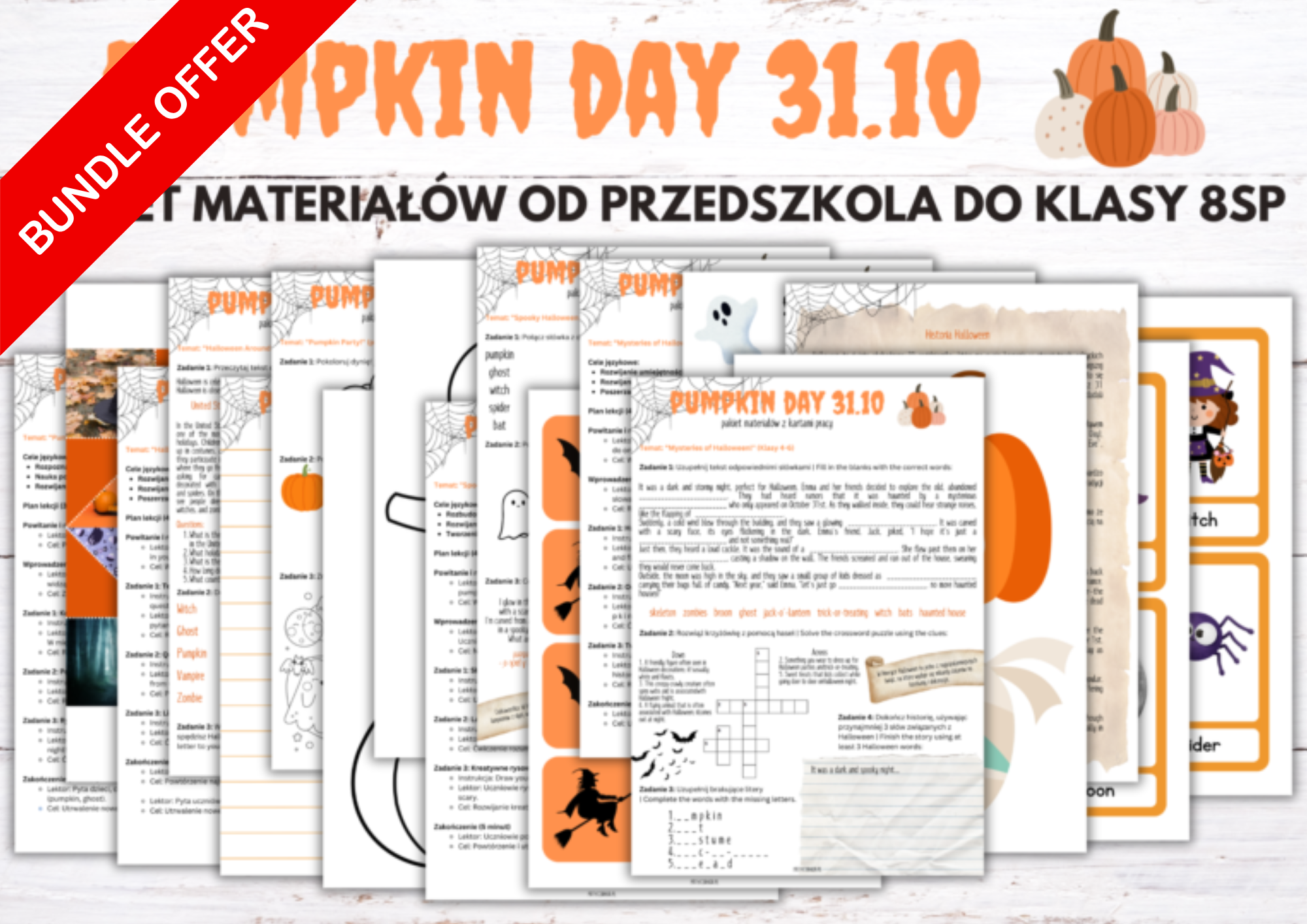 👉 Ten pakiet daje Ci wszystko, czego potrzebujesz, aby zorganizować kompletne zajęcia tematyczne na Halloween i Pumpkin Day – bez stresu i bez dodatkowych przygotowań.