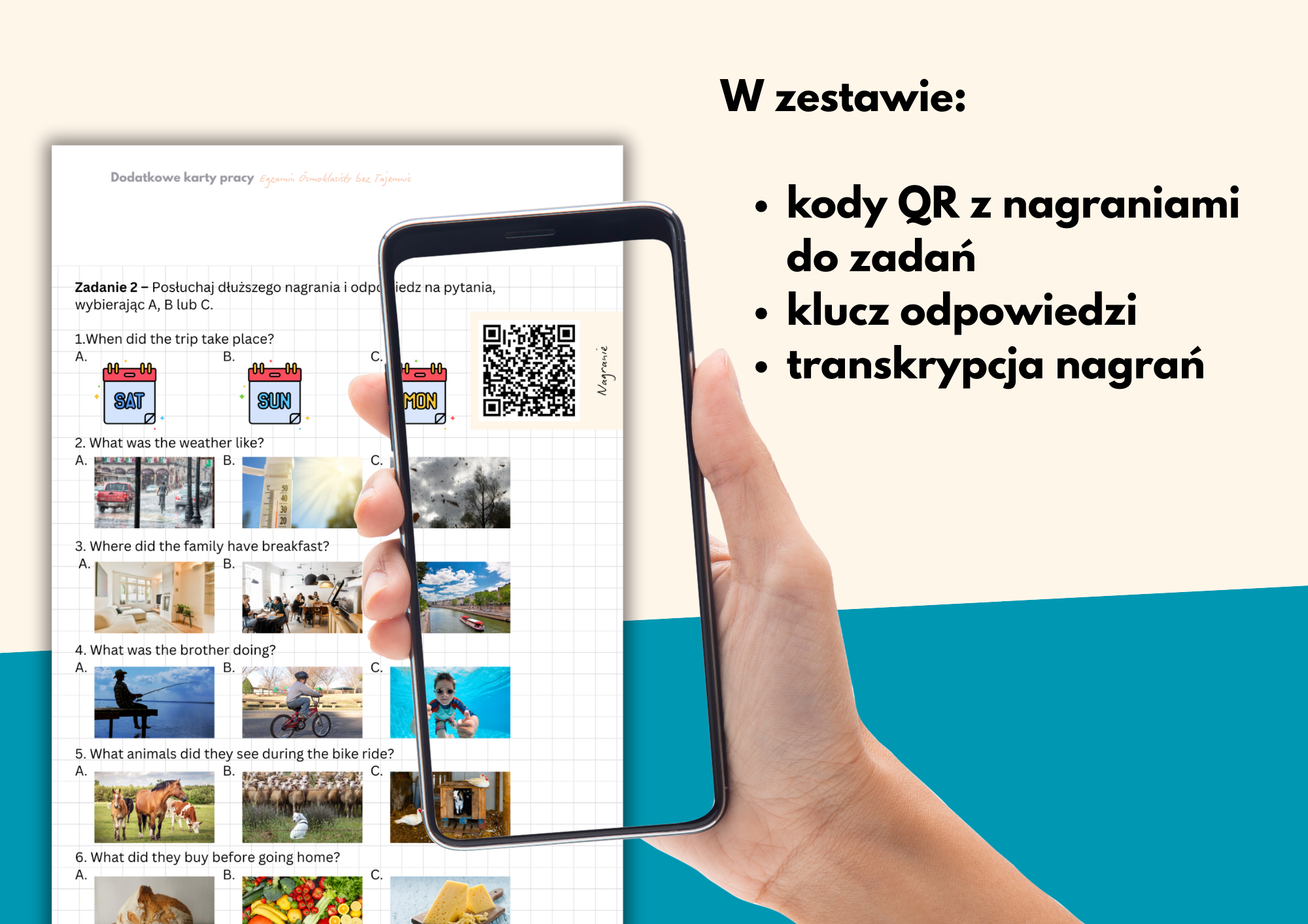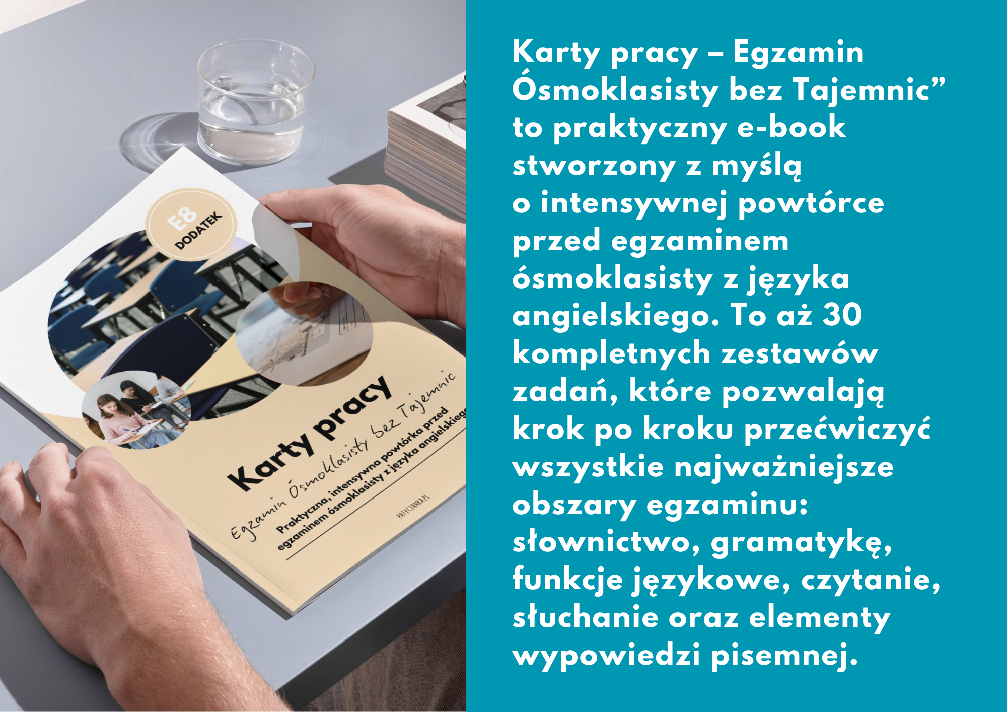 „Dodatkowe karty pracy – Egzamin Ósmoklasisty bez Tajemnic” to praktyczny e-book stworzony z myślą o intensywnej powtórce przed egzaminem ósmoklasisty z języka angielskiego. To aż 30 kompletnych zestawów zadań, które pozwalają krok po kroku przećwiczyć wszystkie najważniejsze obszary egzaminu: słownictwo, gramatykę, funkcje językowe, czytanie, słuchanie oraz elementy wypowiedzi pisemnej.