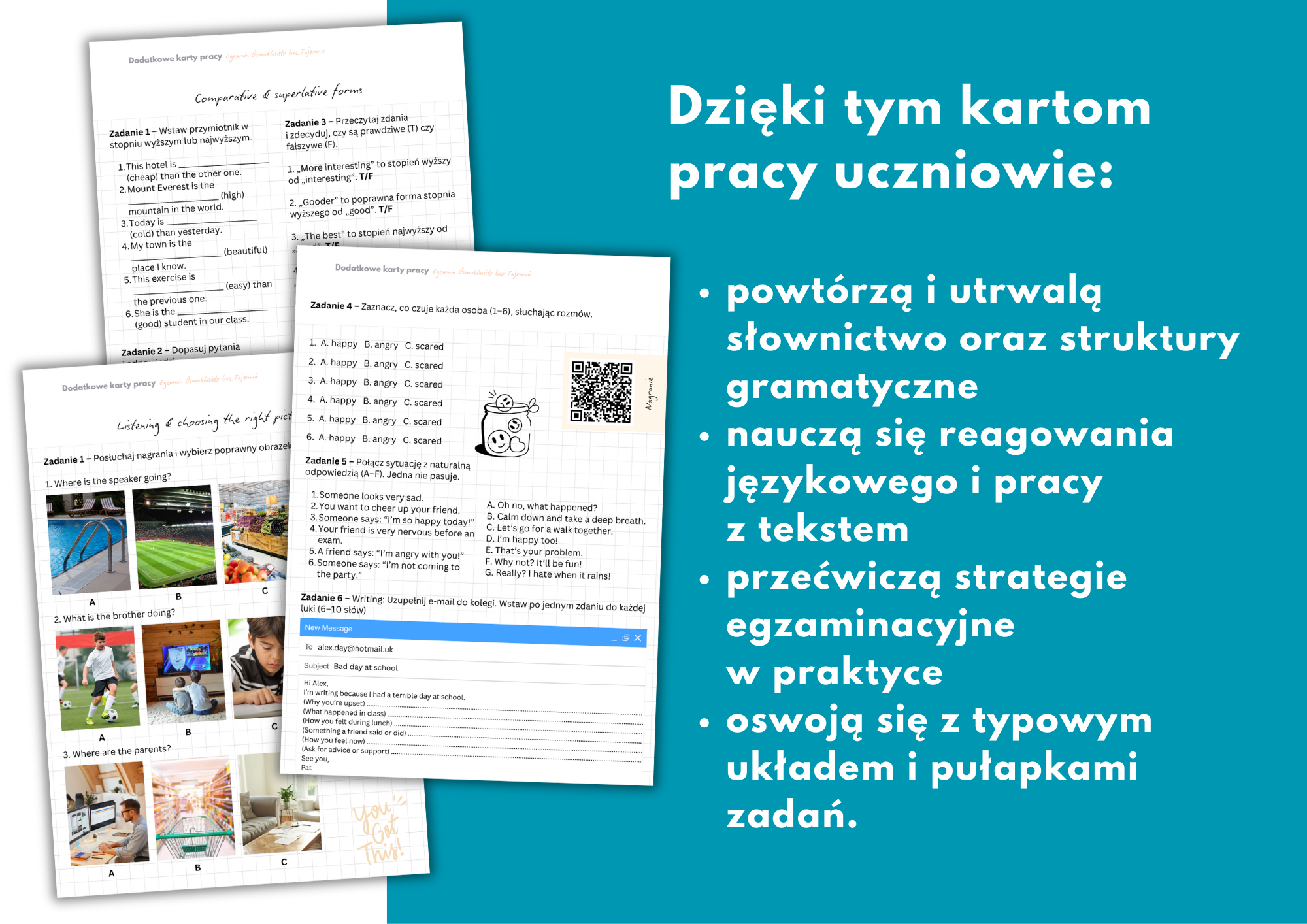 To ponad 100 stron praktycznych ćwiczeń stworzonych przez lektorkę i metodyczkę z 15-letnim doświadczeniem, specjalnie dla ósmoklasistów i ich nauczycieli.