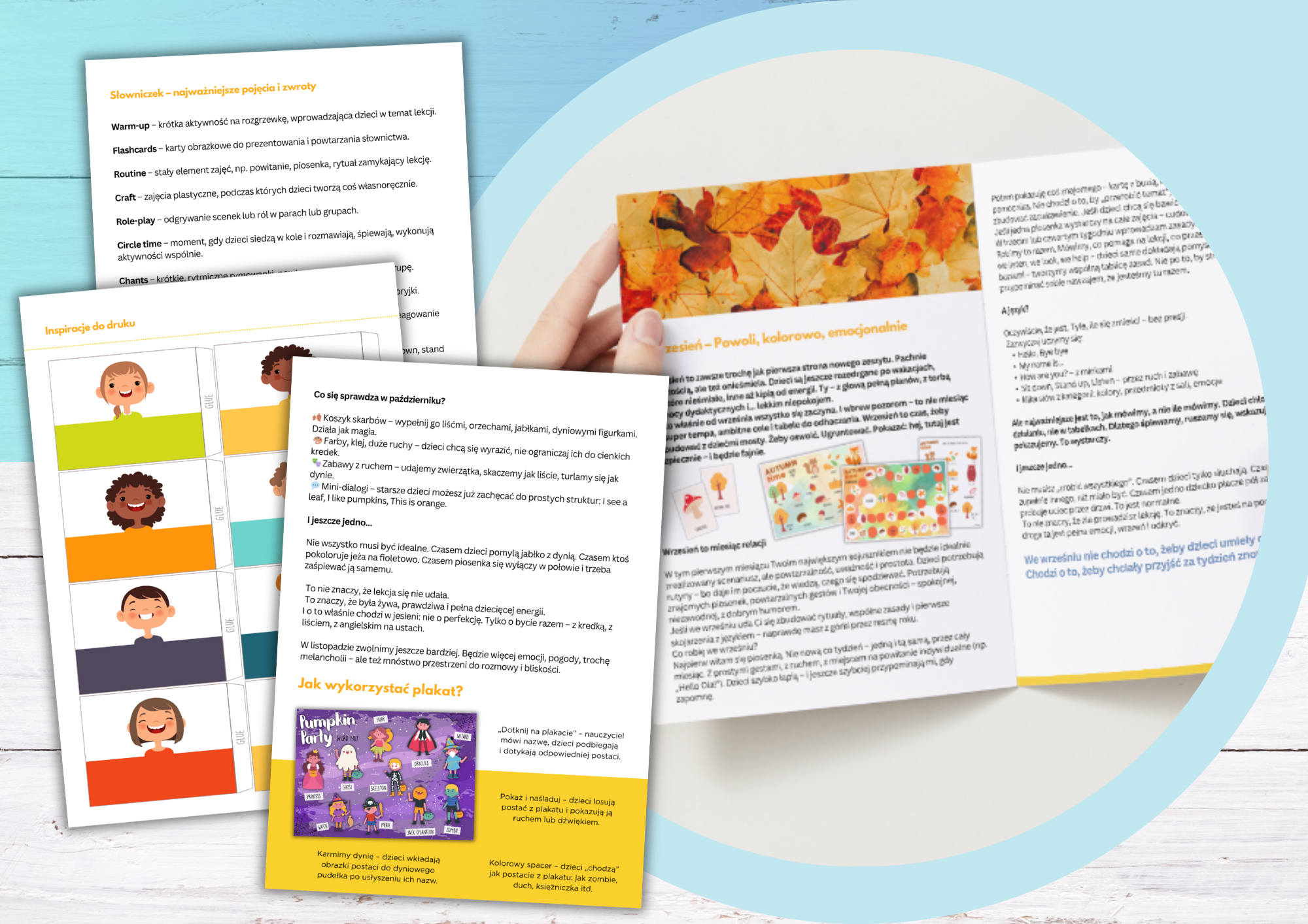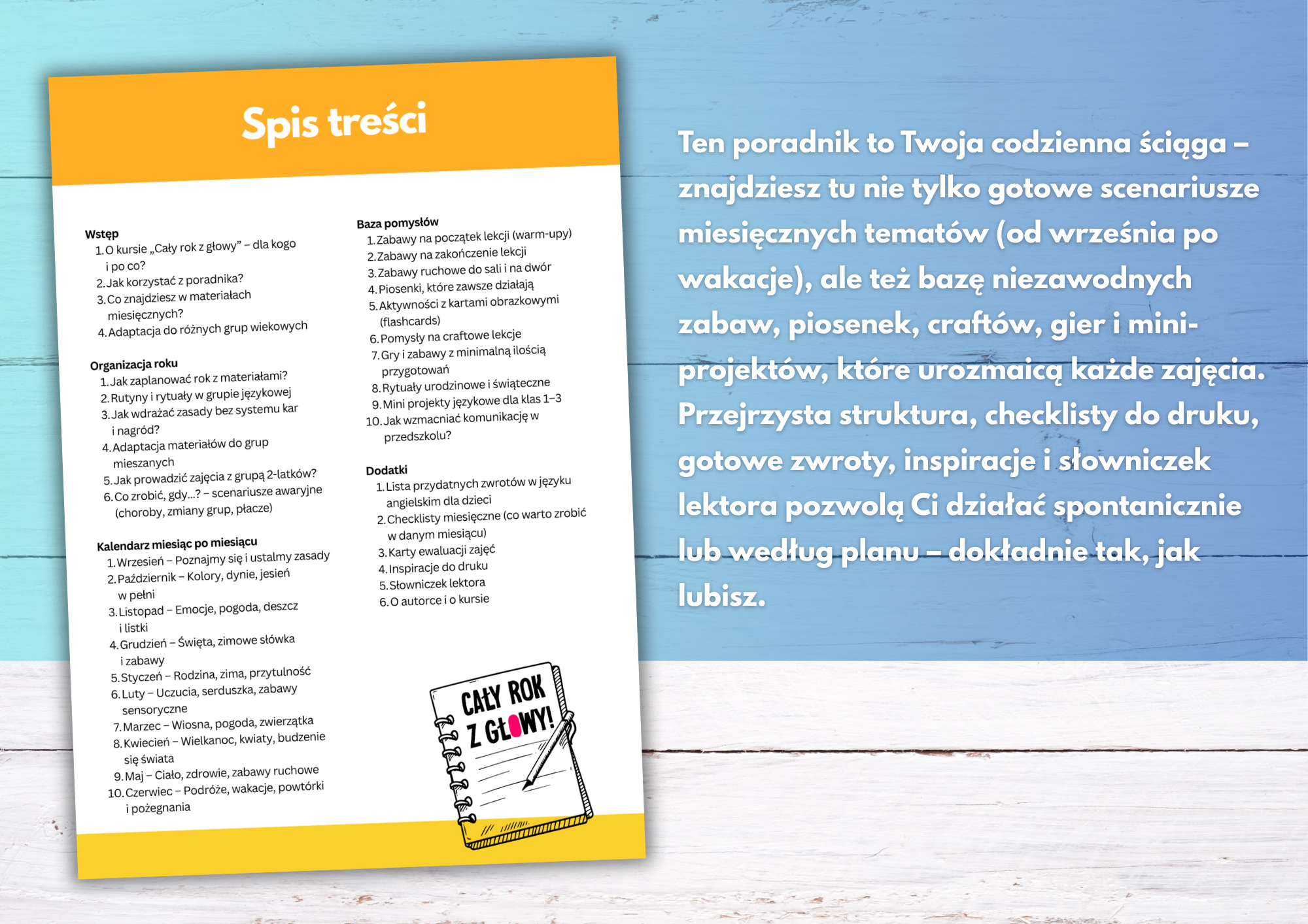 To przewodnik metodyczny, który powstał jako wsparcie do pakietu materiałów „Cały rok z głowy” – ale możesz z niego korzystać zupełnie osobno! To Twoja codzienna ściąga – znajdziesz tu nie tylko gotowe scenariusze miesięcznych tematów (od września po wakacje), ale też bazę niezawodnych zabaw, piosenek, craftów, gier i mini-projektów, które urozmaicą każde zajęcia. Przejrzysta struktura, checklisty do druku, gotowe zwroty, inspiracje i słowniczek lektora pozwolą Ci działać spontanicznie lub według planu – dokładnie tak, jak lubisz.