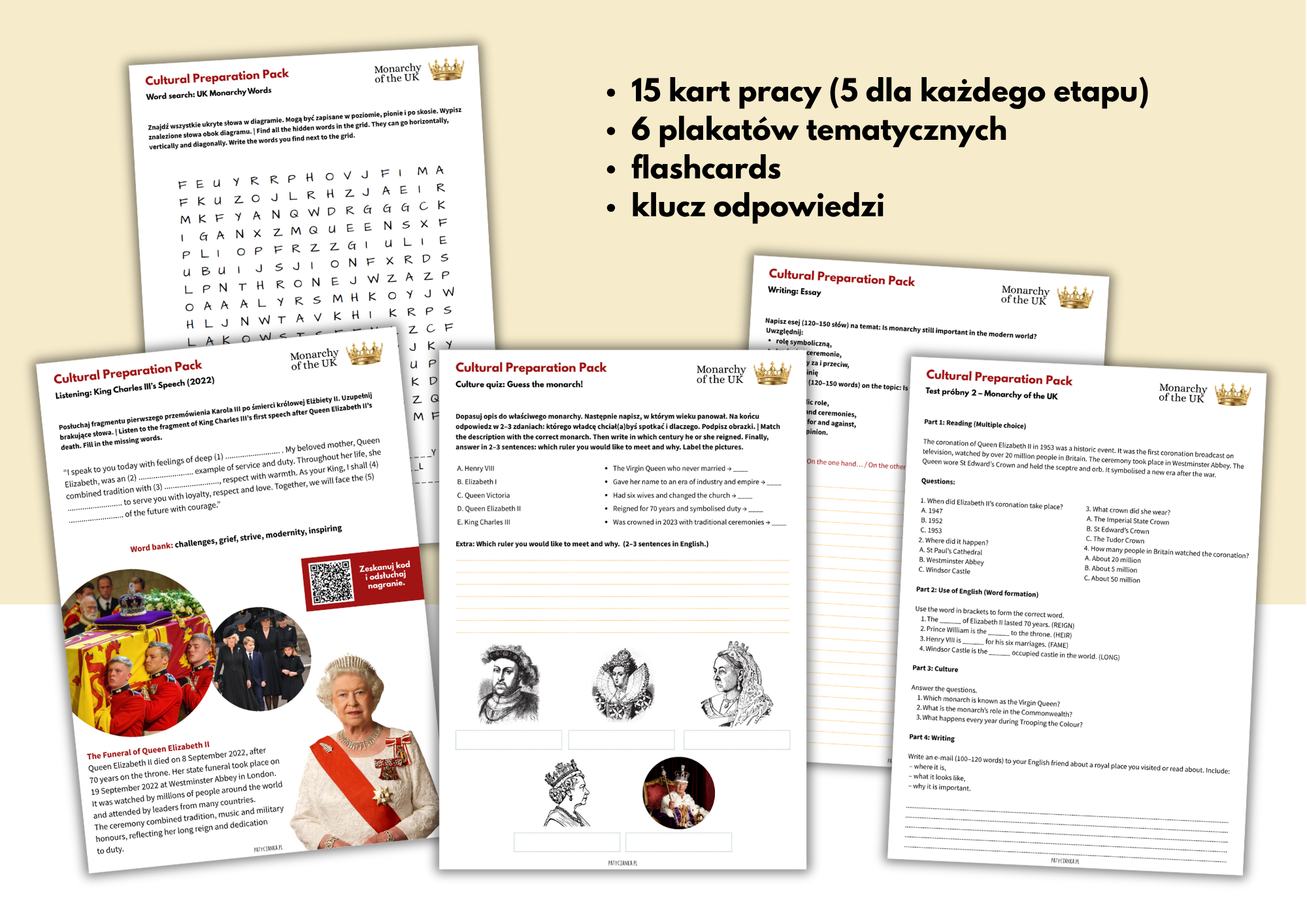 Pakiet obejmuje aż 3 poziomy (szkolny, rejonowy, wojewódzki) i prowadzi ucznia krok po kroku od podstawowych informacji o słynnych królach i królowych, przez symbole i rezydencje królewskie oraz najważniejsze wydarzenia historyczne, aż po współczesną rolę monarchii i jej znaczenie w Commonwealth.