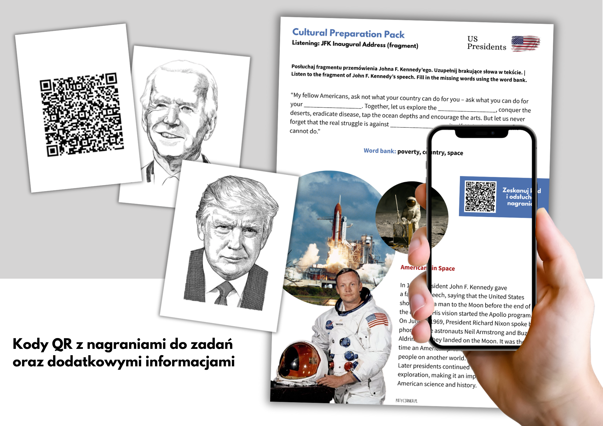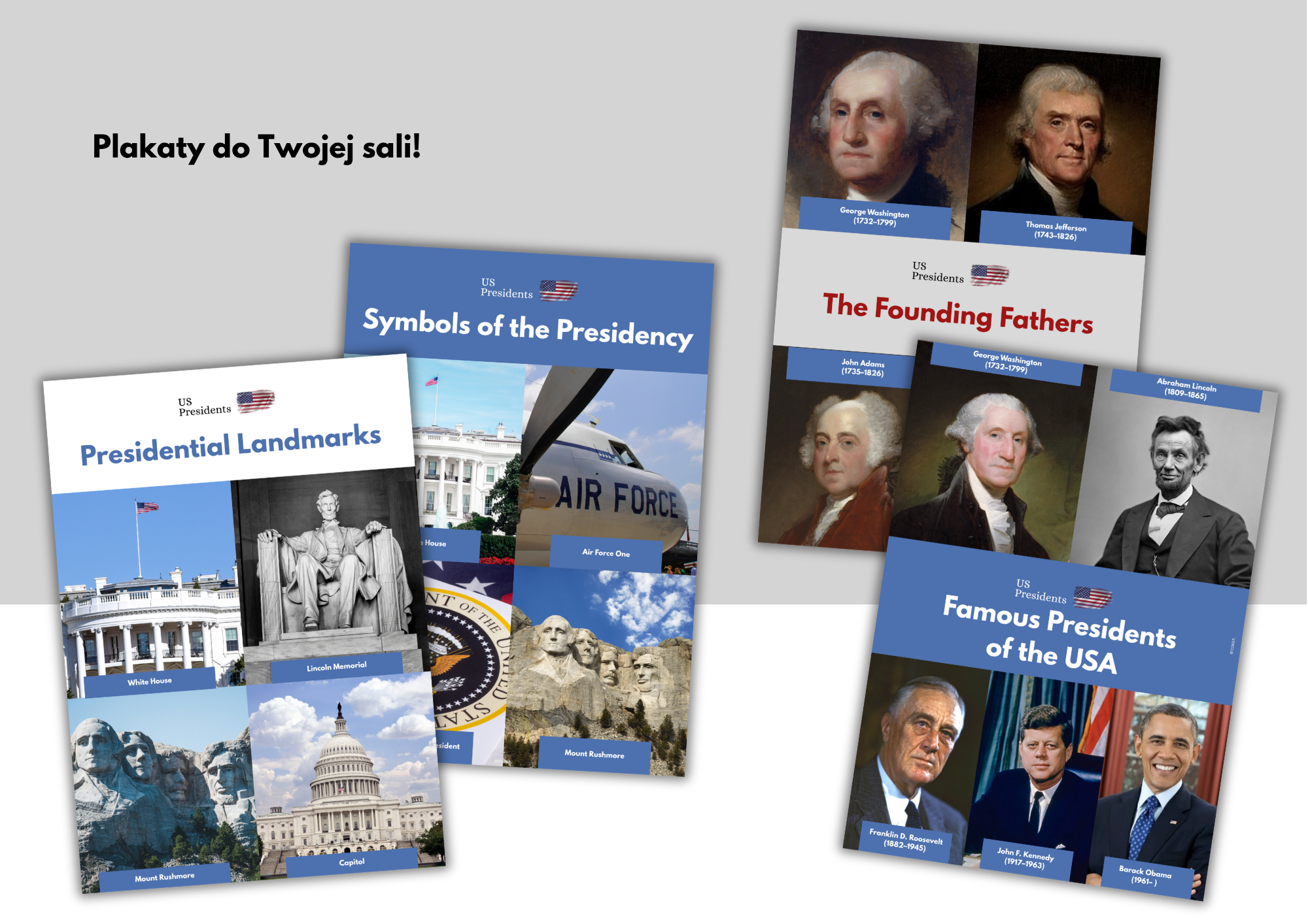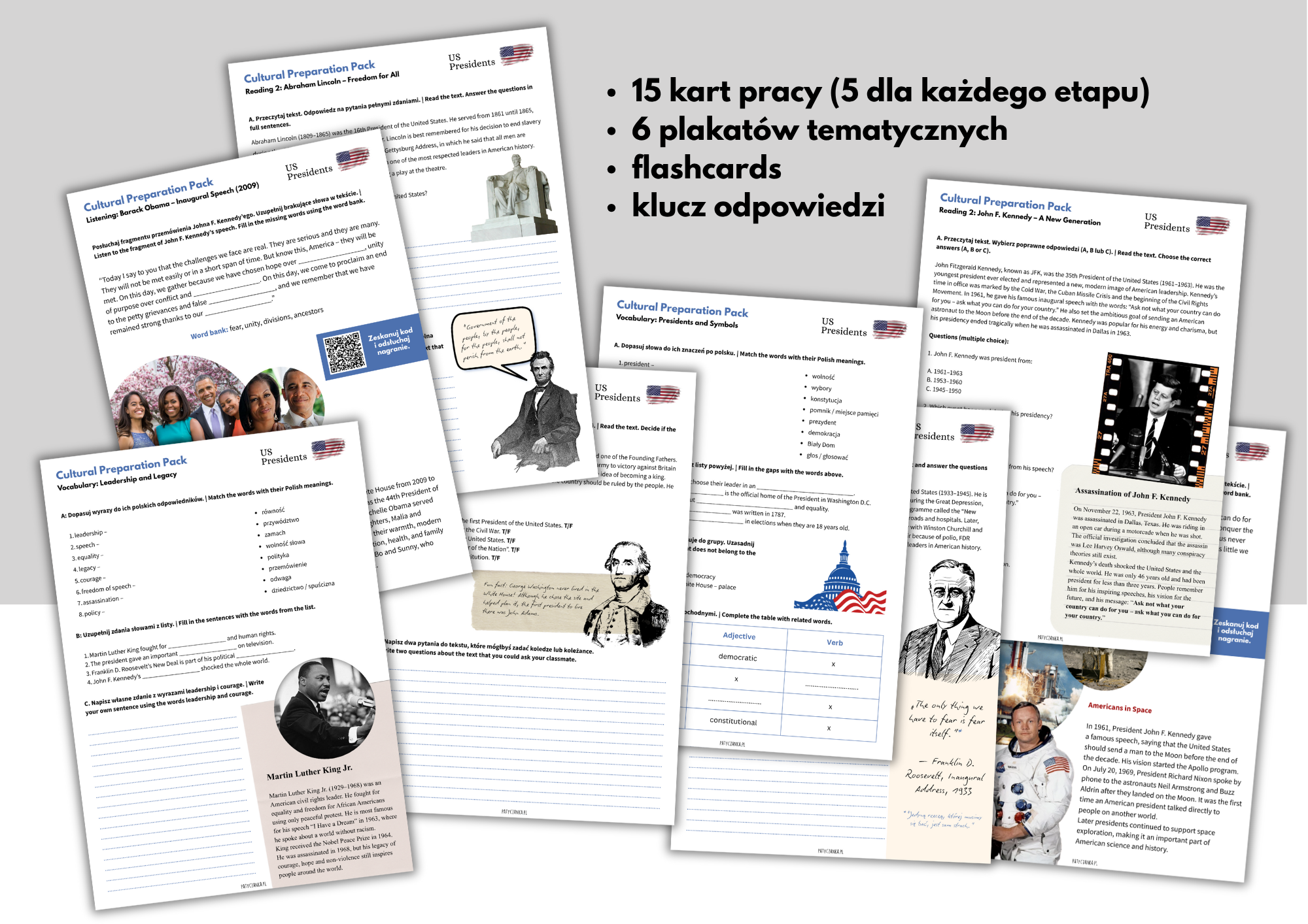 Pakiet obejmuje aż 3 poziomy (szkolny, rejonowy, wojewódzki) i prowadzi ucznia krok po kroku od podstawowych informacji o pierwszych prezydentach USA, przez kluczowe wydarzenia historyczne i słynne przemówienia, aż po współczesną rolę prezydentury i jej wpływ na świat.